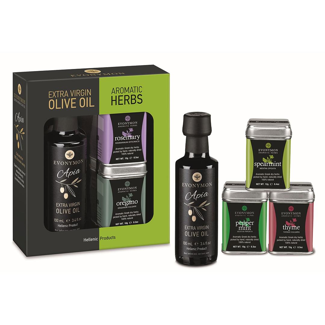 Box with one glass bottle of extra virgin olive oil APIA 100 mL and two tin boxes of Aromatic herbs (Oregano 10 g or Spearmint 12 g or Rosemary 15 g or Peppermint 10 g or Thyme 15 g or Basil 17 g or Lemon Verbena 4 g or Greek Sage 7 g or Chamomile 7 g).