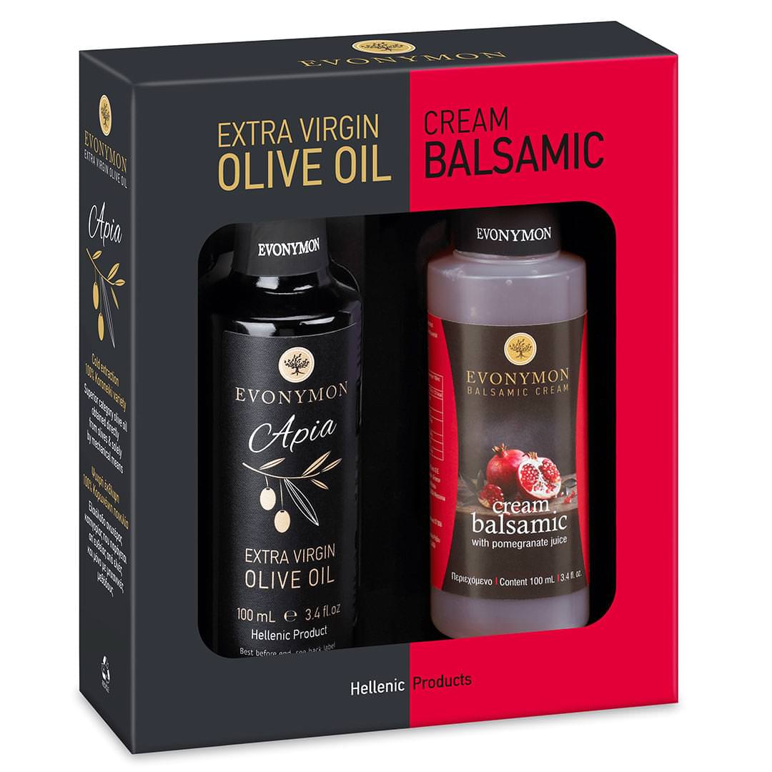 Box with one glass bottle of 100 mL extra virgin olive oil APIA and one plastic bottle of 100 mL balsamic cream with pomegranate juice.