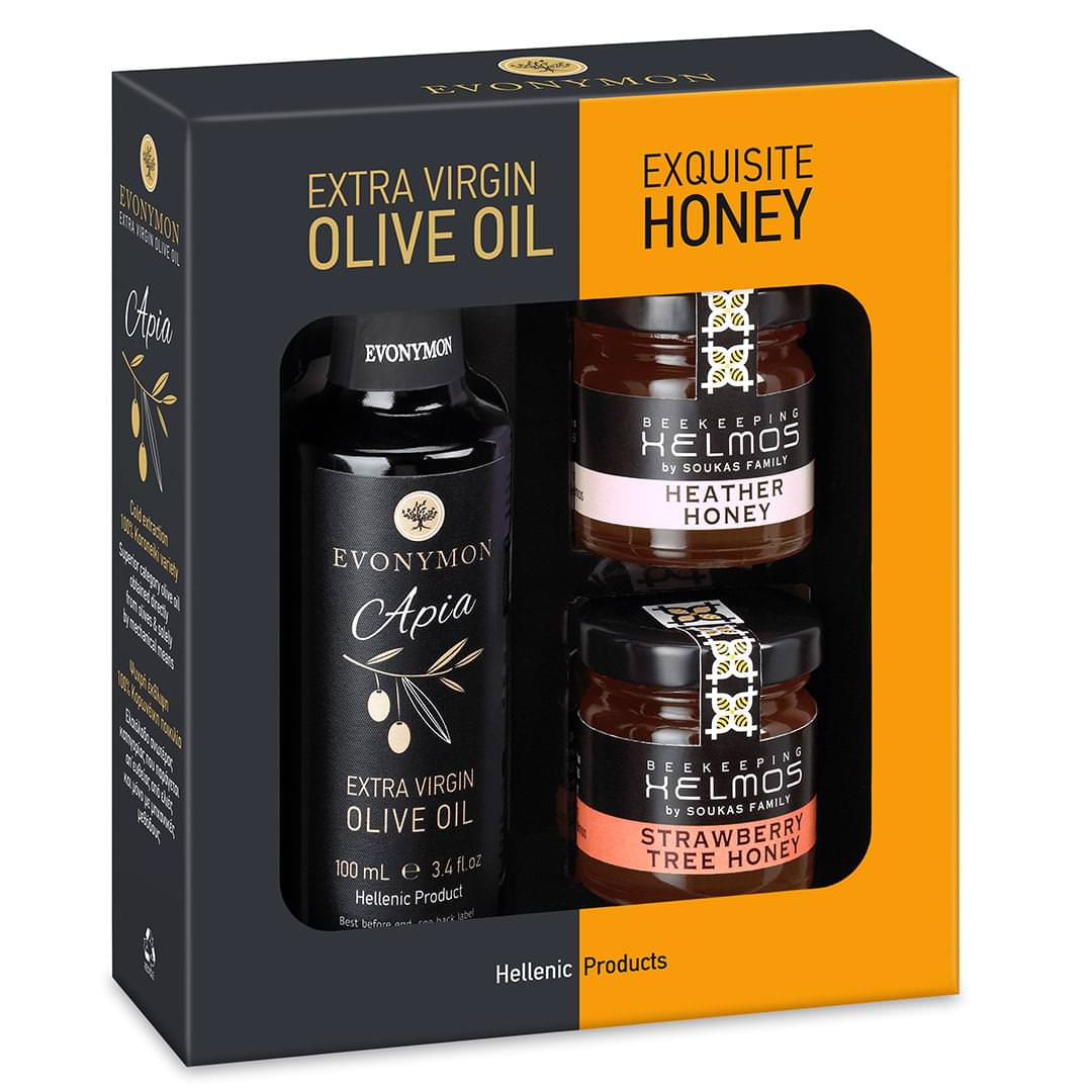 Box with one glass bottle of 100 mL extra virgin olive oil APIA and two jars of 50 g honey, of HELMOS beekeeping.